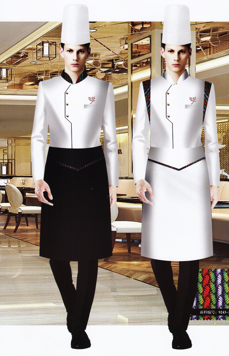 对于餐饮业的灵魂人物--厨师,分为红案和白案两种,自然也有专门的厨务人员服装;大厨、副厨、厨师长、厨师长的风格按照国际惯例,一般采用法国厨师工作服设计风格为标准,通常采用主领、双排扣白色上衣,配黑色斑马条纹、猎犬裤,领口围白色或其他颜色汗巾,戴厨师长高帽。厨师白色涤棉或棉质上衣,白色纽扣,黑白小格子裤,白色帽子,带三角围巾。